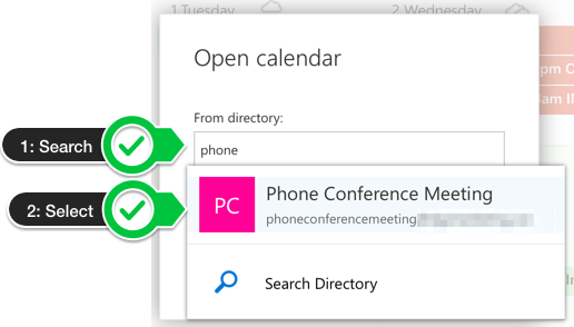 Enter the name or address of the shared calendar you'd like to open and hit enter to search for it.