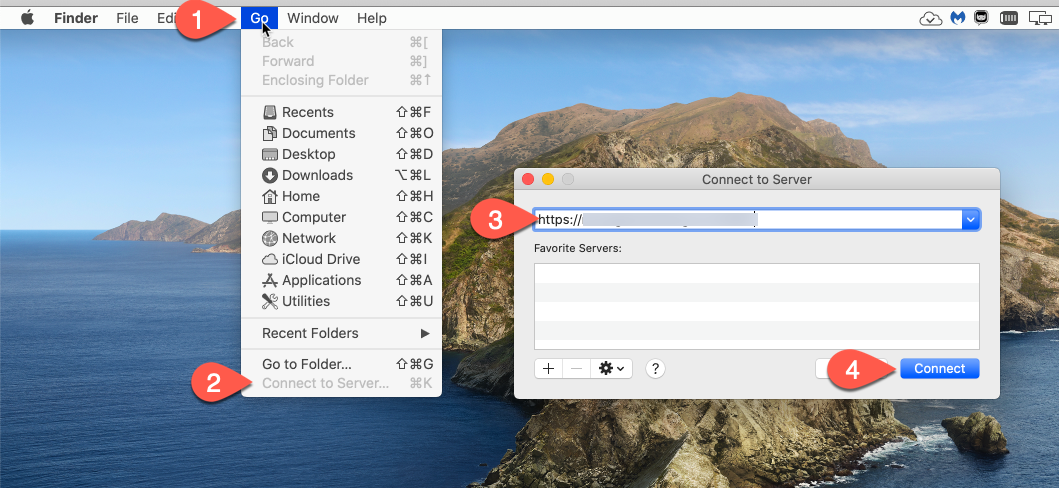 - Choose "Connect to Server" (or hit command and k for you keyboard jockeys)