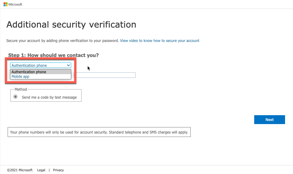 Because we enforce 2-factor authentication, you may be asked for additional information however. If you prefer to receive a text message or phone call with your authentication code, choose "authentication phone." If you prefer to use an authenticator app like Microsoft Authenticator or 1Password, choose "Mobile App." For the purposes of this tutorial, we'll assuming you're using your phone. To view a video on how to setup Microsoft Authenticator, see this video: How to register for Azure Multi-Factor Authentication - YouTube