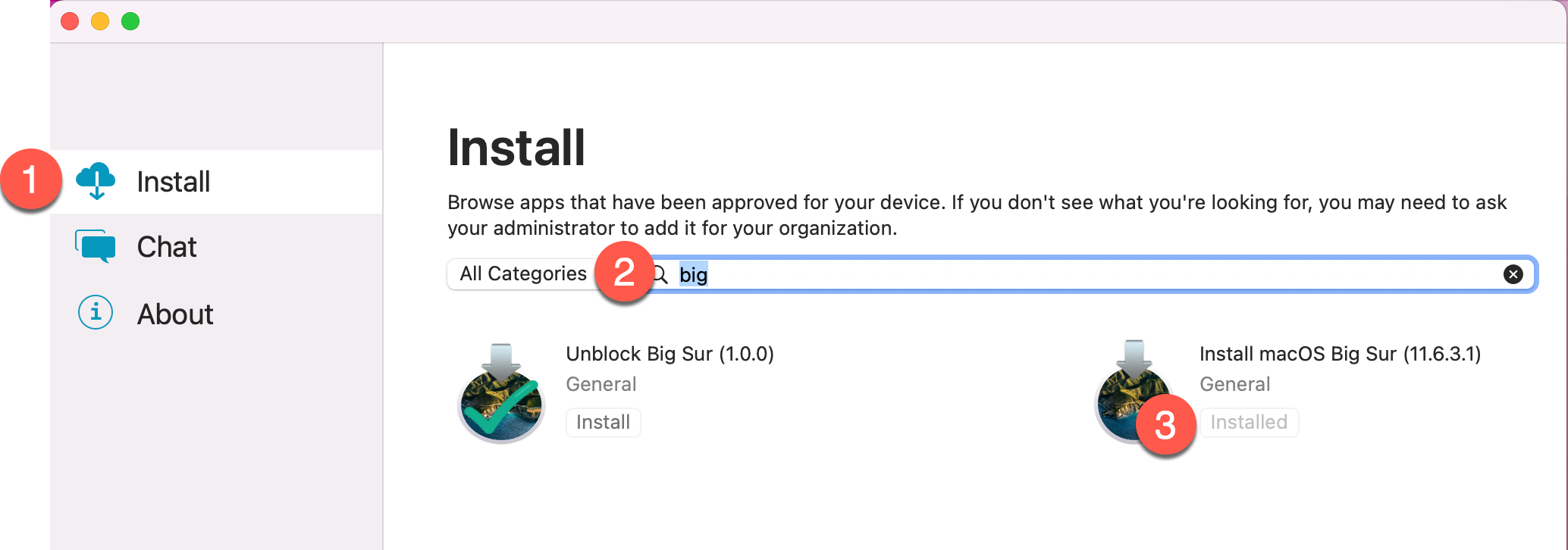Select install at the left and search for or find "Install macOS Big Sur" and click "install." (Note that the screenshot is from a machine that already has Big Sur, but your button will read "install" and be clickable.)