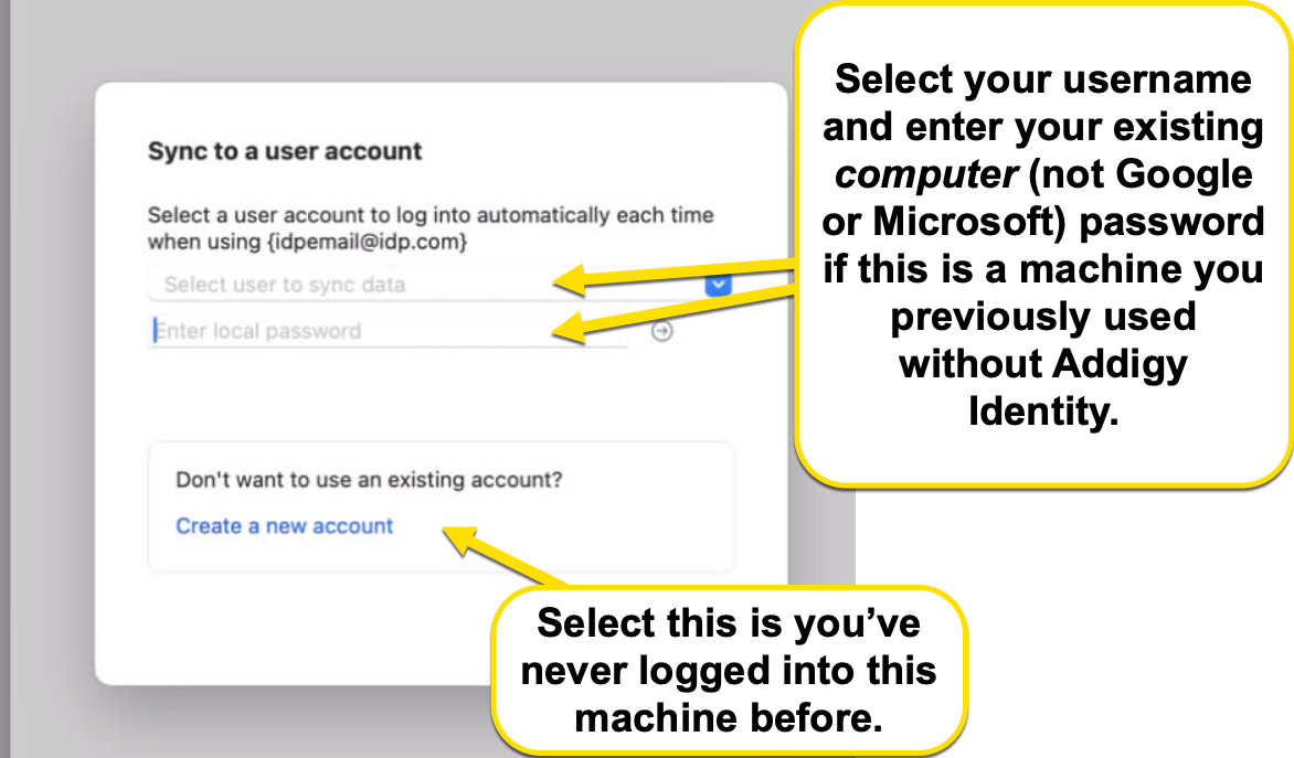 If you've previously used this computer with a local account, select your username from the drop-down menu and enter your previous computer password (which may be different than your Addigy Identity password)